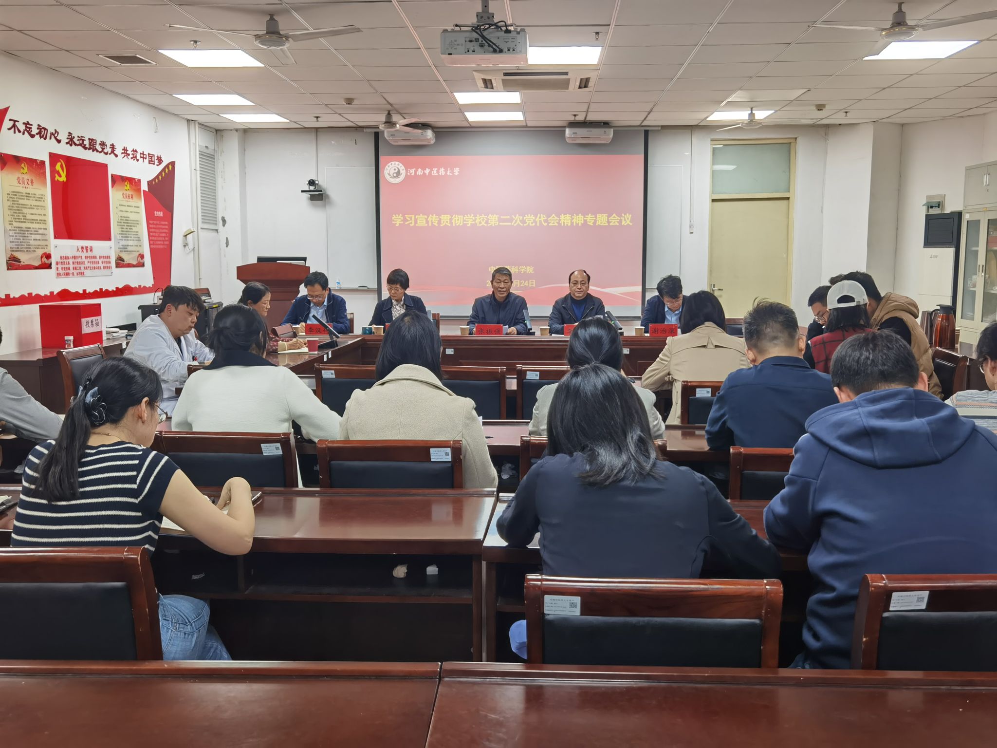 本网讯(文/王胜超 图/张钟允) 为深入学习贯彻河南中医药大学第二次党代会精神,统一思想、凝聚共识,引领激励全院教职工自信自强、奋勇争先,致力于建设具有鲜明特色的一流研究型中医药大学。3月24日下午,葡京娱乐场官网平台 召开学习贯彻学校第二次党代会精神专题会。副校长张振强到会指导,葡京娱乐场 班子成员、各基层党支部书记、行政及业务科室负责人参会。会议由党委书记李东阳主持。