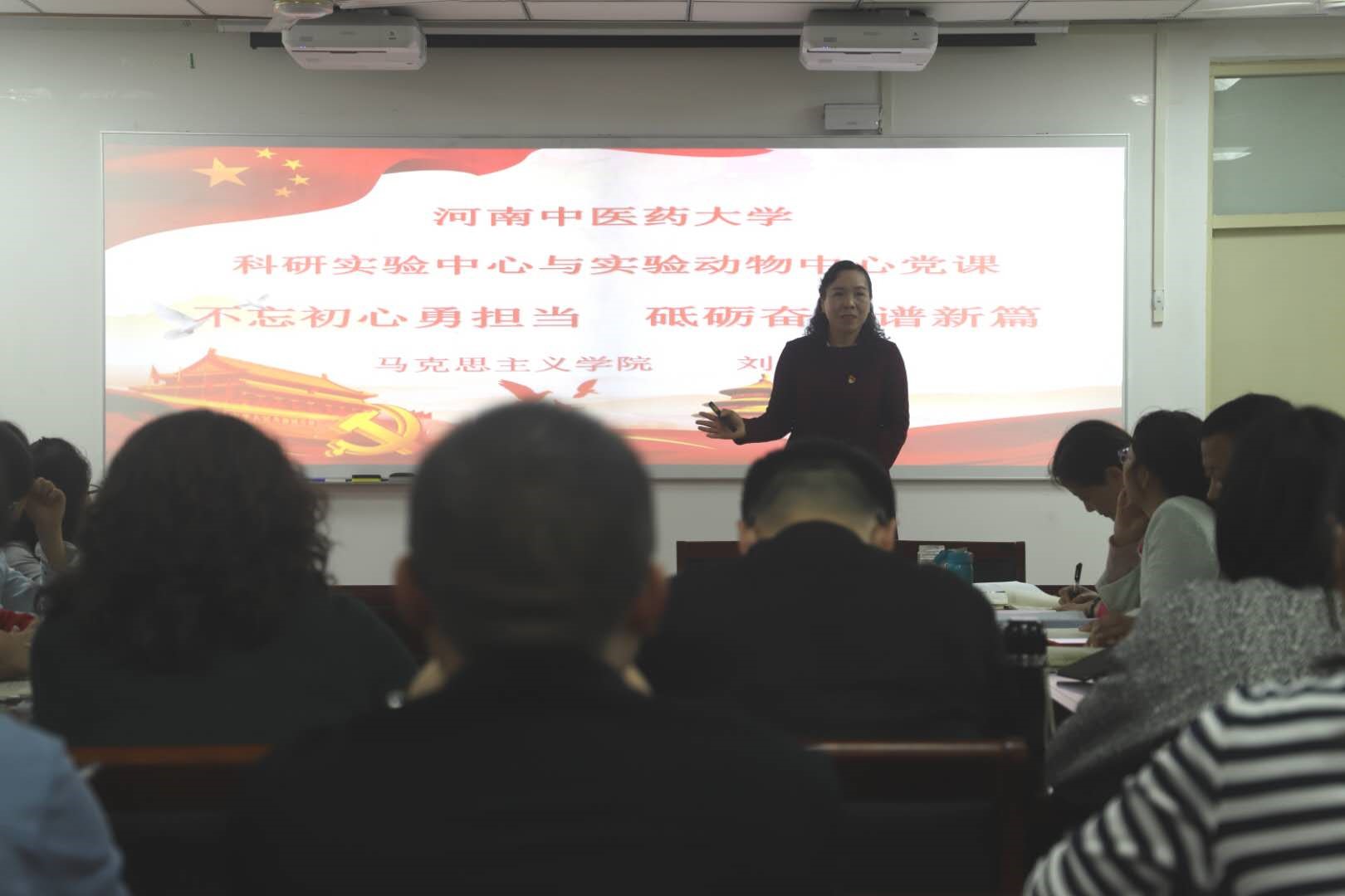 刘金鸽副教授以《不忘初心勇担当砥砺奋进谱新篇》为题,从“四次会谈”“平语近人”展开,生动讲述了“什么是为民、为什么为民、怎么样为民”,并围绕“不忘初心砥砺奋进为人民、不忘初心砥砺奋进敢担当、不忘初心砥砺奋进育杏林”等内容,深情回顾了《共产党宣言》的诞生过程和淮海战役的惊心动魄,讲述了中国共产主义的先驱——李大钊、“人民的好公仆”——焦裕禄和现代航空与火箭技术的先驱——钱学森等中国共产党优秀前辈的生动事迹,让现场师生深切感受到了共产党人的伟岸、博大、无私的情怀,进一步彰显了中国共产党人的初心和使命。刘金鸽副教授在党课中表示,科学研究和技术服务是科研实验中心与实验动物中心的两项重要职能,大家要时刻牢记全心全意为人民服务的宗旨,为全校师生提供优质服务,不忘初心、坚定信仰、勇于担当、敬业仁爱,用“闯劲、钻劲、韧劲”不断学习,努力提升科研能力和水平,助力学校转型发展。