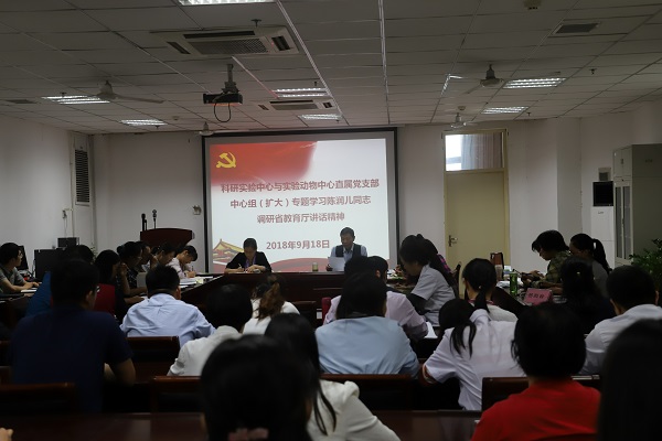 为进一步贯彻校党委《关于认真学习宣传贯彻陈润儿同志调研省教育厅讲话精神的通知》的部署和有关要求,2018年9月18日下午15:00在教学综合大楼BM739会议室,我中心党支部召开专题学习会,中心69位教职工参会,书记张振强主持会议。