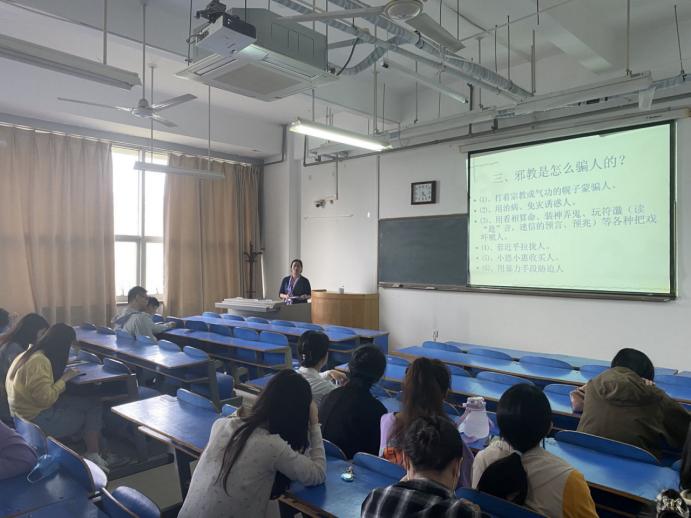 杨文胜向同学们详细普及了反邪教知识,全面讲解了邪教的特征、怎样认清邪教、邪教的本质是什么、怎样远离邪教等知识要点。同时有针对性地言讲大学生受邪教侵害典型案例、目前存在的主要邪教组织及防范和处理邪教相关法律条款、政策等。