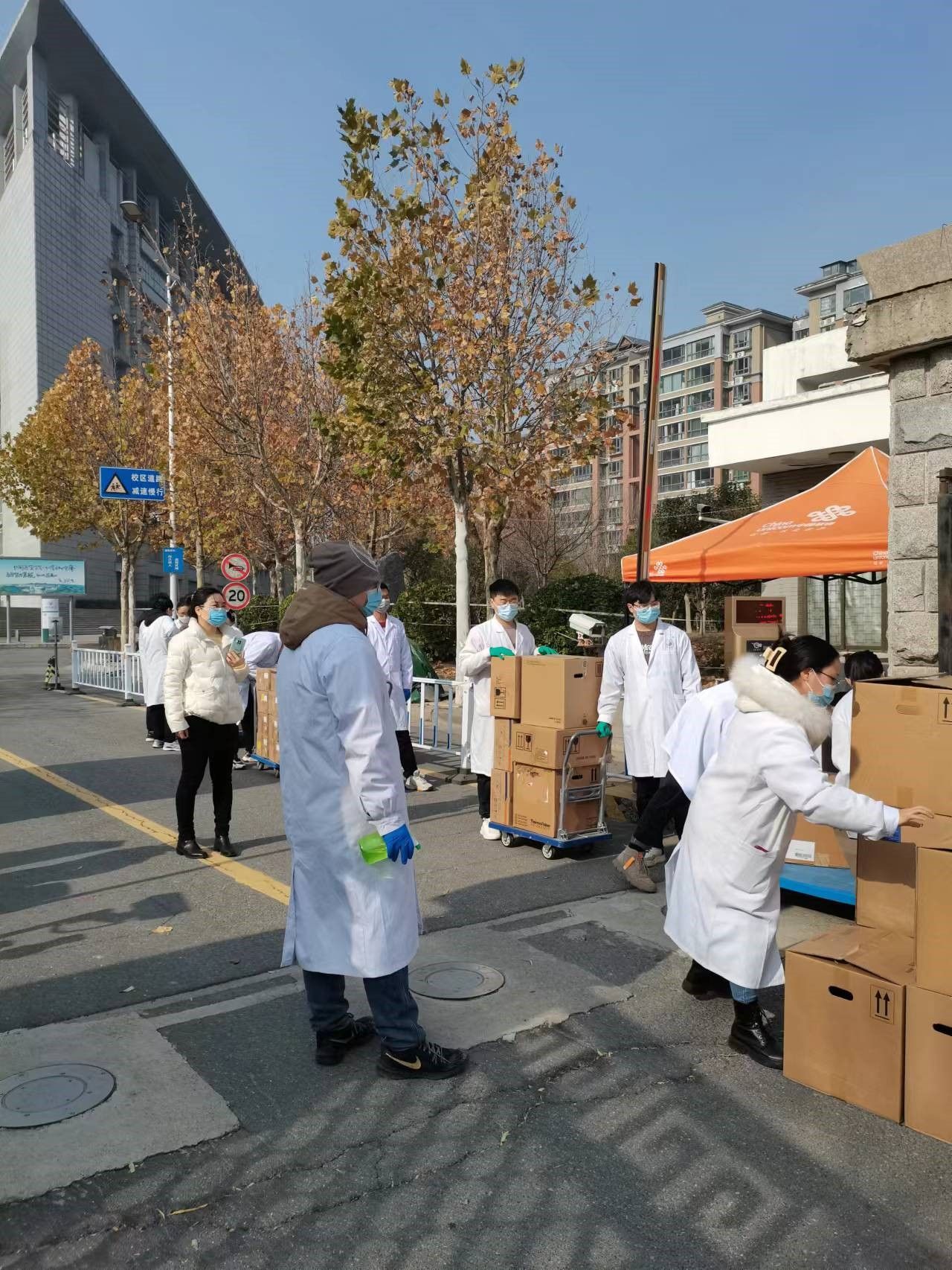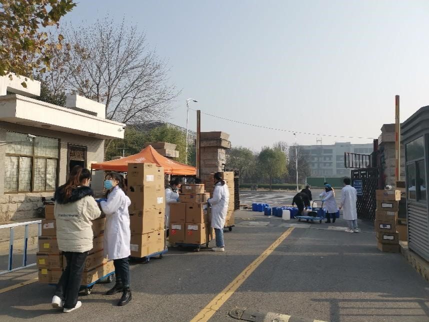 二是加强组织。为保证转运现场安全有序,张振强院长全面统筹安排协调校内外师资力量,各部门通力合作,成立转运工作小组。其中校内驻守的老师分成3组:转运组负责危险废弃物的标识张贴和分类包装检测与称重;防护组负责防护物资、消防物品调配、运输;维稳组负责疏散人群,维护现场及周边的转运秩序,并随时做好应急救援准备。校外居家办公的老师分成2组:联络组负责联系并核验环保转运人员的健康信息,保障通信畅通;传递组负责对待收危废的传递,转运推车的消毒,保障校内师生与转运分检人员无接触安全转运。