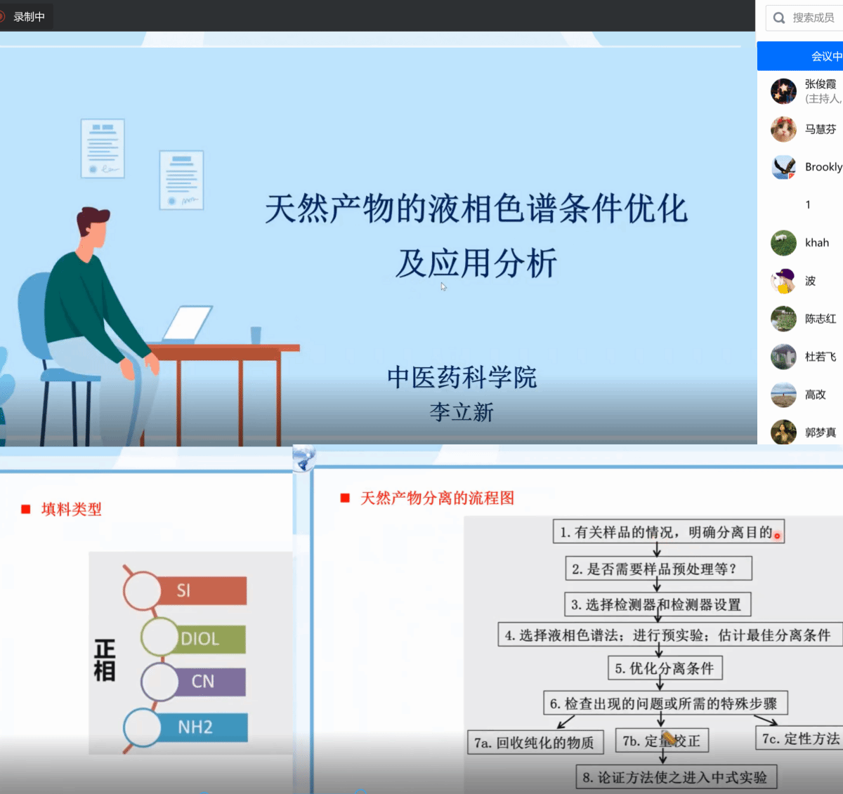 宣讲中,李立新首先根据液相色谱分离的主要参数的公式介绍了不同流动相、色谱柱对分离效果的影响,其次通过天然产物分离的流程图讲解了色谱柱及硅胶等固定相如何选择,最后通过不同天然产物的分离案例总结液相色谱在药物分离优化方面的应用。在互动环节,李立新对大家提出的不同色谱柱的应用、天然产物分离时溶剂的选择以及分离效果的分析等问题作出专业解答。