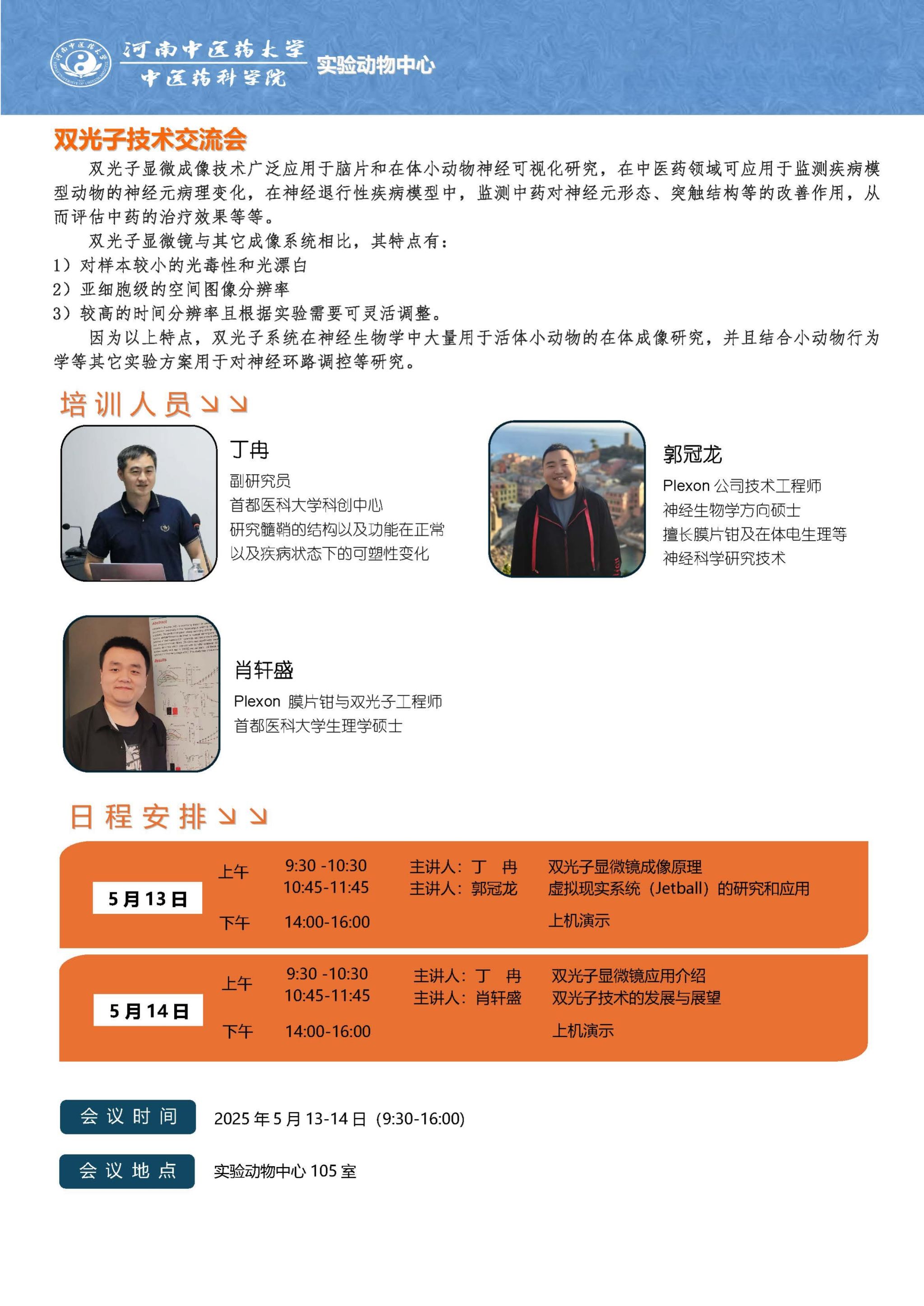 为此,实验动物中心特邀首都医科大学科创中心副研究员丁冉、双光子工程师郭冠龙、肖轩盛进行技术讲座及交流。会议时间:2025年5月13-14日(9:30-16:00),会议地点:实验动物中心 105 室。欢迎广大师生参与。