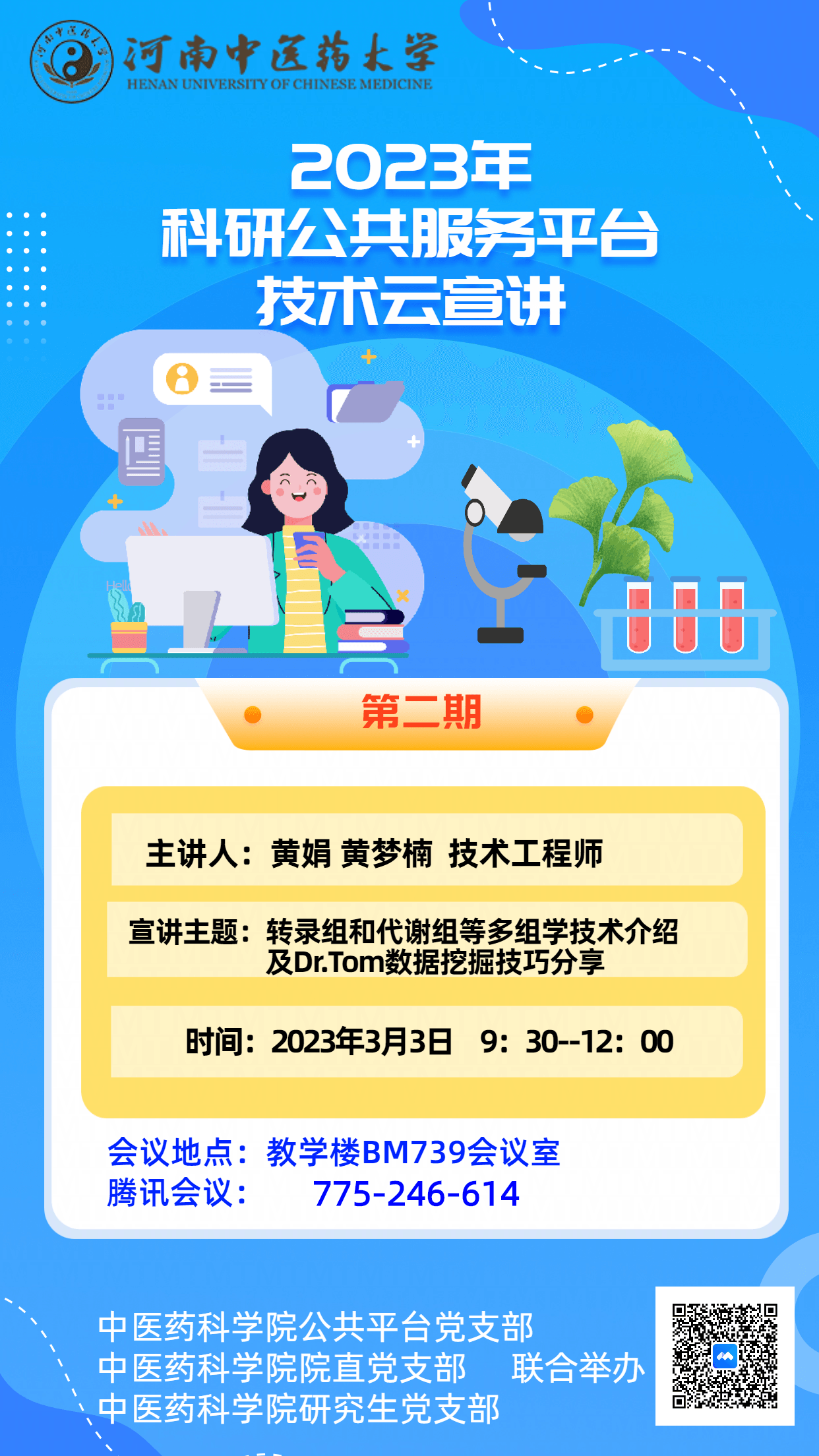 本次宣讲主题:转录组和代谢组等多组学技术介绍及Dr.Tom数据挖掘技巧分享;时间:3月3日(周五)9:30-20:00;主讲人:黄娟 黄梦楠 技术工程师;会议地点:教学楼BM739会议室,腾讯会议:775-246-614,欢迎广大师生参与。