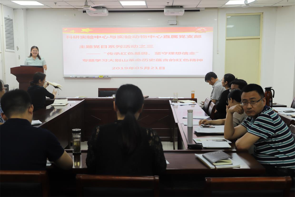 ( 文/杨念 图/李晓康) 2019年05月21日下午15:00在教学综合大楼BM739会议室,科研实验中心与实验动物中心直属党支部开展主题党日系列活动 "传承红色基因、坚守理想信念"专题学习大别山革命历史蕴含的红色精神。中心领导班子、支部委员、党小组组长、业务科室主任和全体科级干部参加。会议由张振强书记主持。