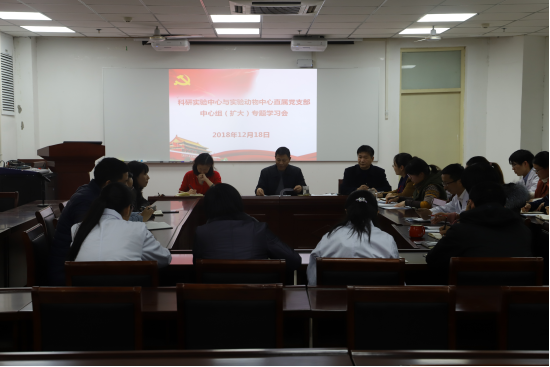 为进一步贯彻落实学校关于认真学习贯彻习近平总书记重要指示精神和向“时代楷模”张玉滚同志学习活动的通知,按照中心组理论学习计划,2018年12月18日下午15:00在教学综合大楼BM739会议室,科研实验中心与实验动物中心直属党支部召开中心组(扩大)专题学习会。中心领导班子、支部委员、党小组组长、业务科室主任和全体科级干部参加。会议由张振强书记主持。