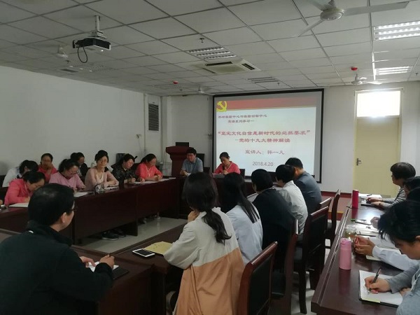 4月20日上午9点,科研实验中心与实验动物中心在教学综合大楼BM739会议室举办党的十九大精神专题党课学习,本次学习特邀我校党的十九大精神宣讲团专家韩一凡博士以“党的十九大精神解读—坚定文化自信是新时代的必然要求”为题进行宣讲,中心全体教工参加。