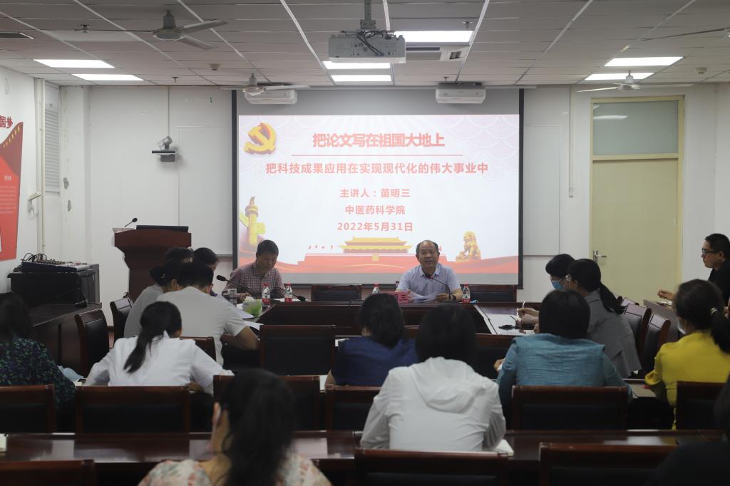 首先,苗明三详细解读习近平总书记提出把论文写在祖国大地上的精神内涵,指出重要科技成就离不开党的坚强领导,广大科研工作者特别是党员教职工要提高政治站位,起到示范引领的作用,将党建和业务有机结合,以党建引领科研发展,坚持面向世界科技前沿、面向经济主战场、面向国家重大需求、面向人民生命健康、面向中医药事业伟大复兴。这也是科葡京娱乐场 需要做好攻占科研战略高地和培养人才工作的目标方向。科研工作是高校核心竞争力和综合实力的体现,科葡京娱乐场 近年来在科研发展上取得了一定的成绩,必须继续支持和鼓励全院科技工作者紧跟国家重大战略、重大需求、重大前沿、重大贡献、重大成果,对标一流水平,根据国家发展急迫需要和长远需求,着重凝练研究方向,敢于提出新理论、开辟新领域、探索新路径,多出战略性、关键性重大科技成果,聚焦“卡脖子”关键技术难题,不断向科研的广度和深度进军,推动中医药行业和产业创新驱动发展,多出科研精品力作,把科技成果应用在实现社会主义现代化的伟大事业中,更好地服务国家发展战略需求和地方经济社会发展,为新时代科学家精神写下精彩注脚,用实际行动把论文写在祖国大地上,不负时代赋予我们的机遇,不负国家和人民的期望。