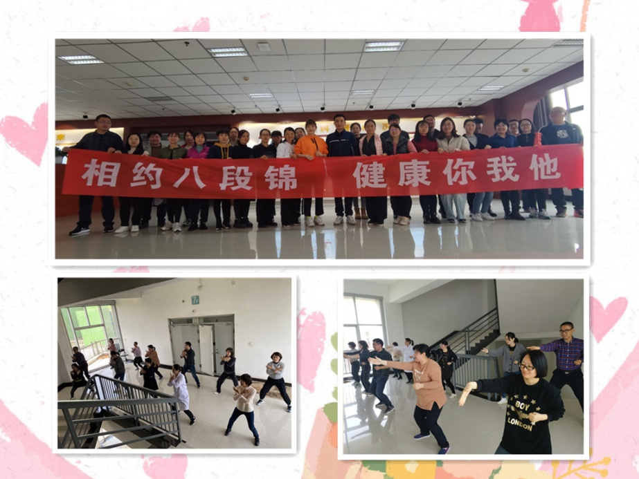 培训后近2个月来我院工会积极组织老师利用工作之余自发练习,从每一招每一式的生疏到熟练直至有了神韵,大家在弘扬传承“八段锦”功法的同时,努力提高“八段锦”功法的熟练程度和统一、规范的团队整合度。